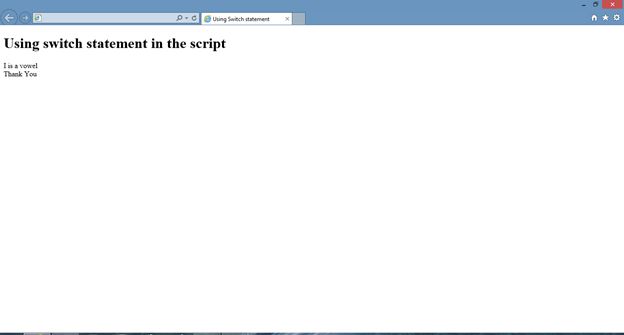 letter” is the expression of switch statement. The value of the letter variable is compared with the case values one by one. When a match is found, which in this case is the third case statement, the set of statements specified in the case is executed.