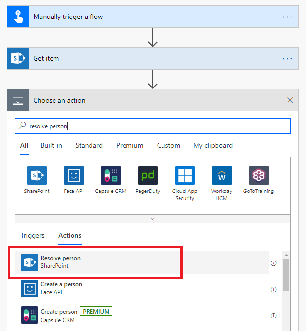 If you have worked on SharePoint for a long time, then you must have used EnsureUser function to generate SPUser objects using an account name. Similar to this is the Resolve Person action in FLOW. It takes Email ID as an input and returns a single matching user value which can be assigned to a column. If there are no matches, or multiple matches, this action will error out.