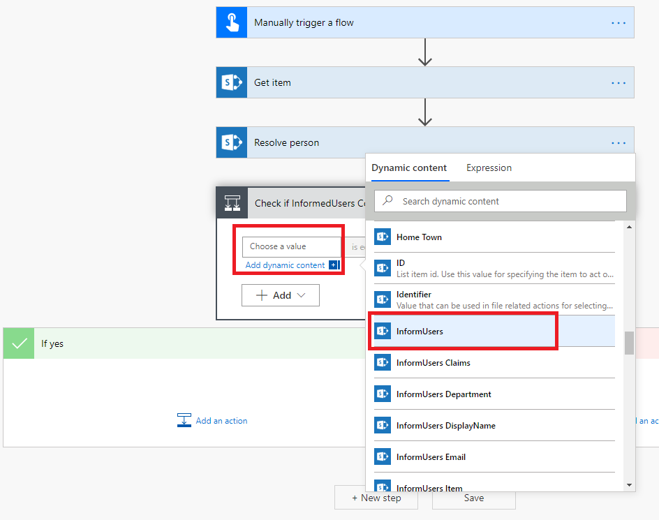 Now add a condition action > on left side select InformUsers column from output of Get Items action