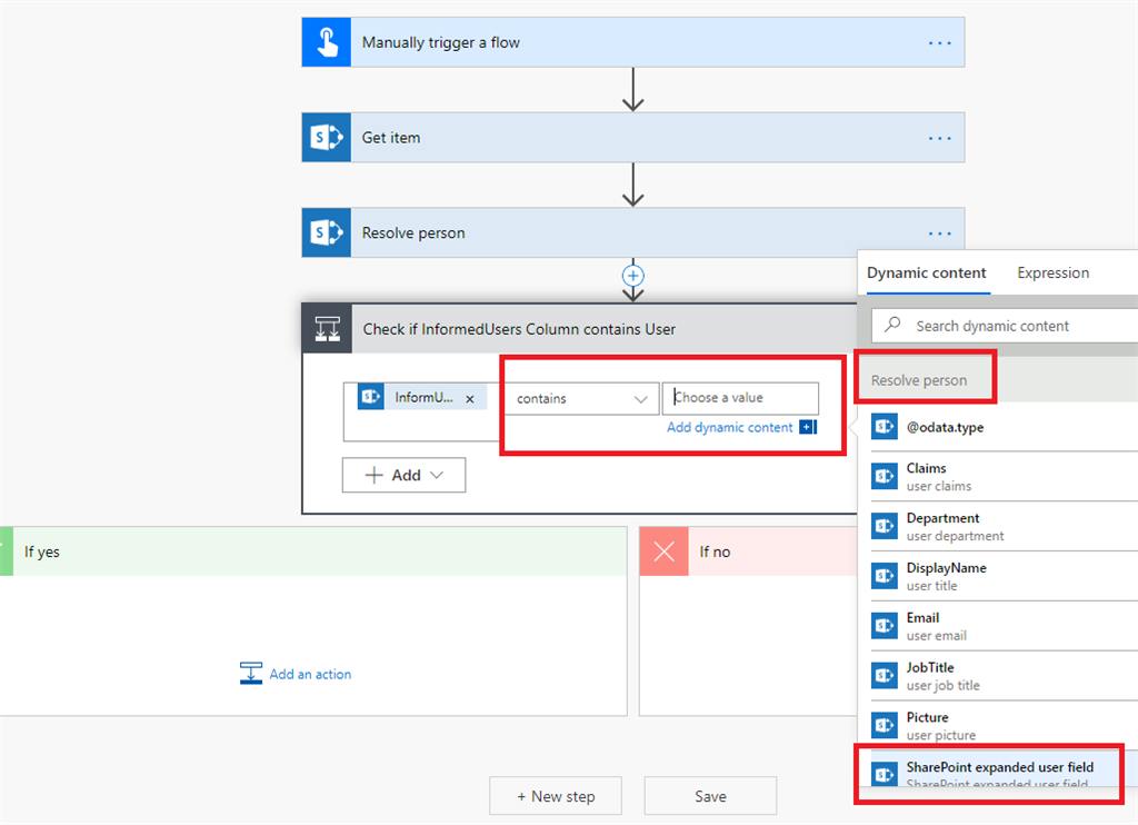 Use Contains operator > on the right-side use output of Resolve Person action "SharePoint expanded user field" > We are trying to find a person object in person and group field