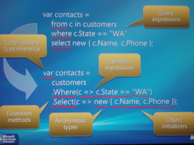 Here is a screen from Session notes on new C# 3.0 features.