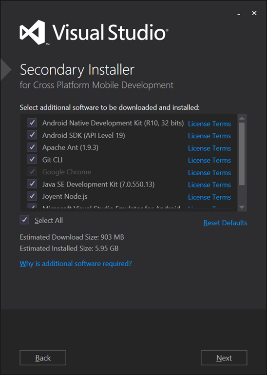 If you plan to do Cross Platform development, Visual Studio will install several third party tools and SDKs for Android, Apache, Git, Java, Node and so on. Just for cross platform tools and SDKs, expect to have 6GB free space available.