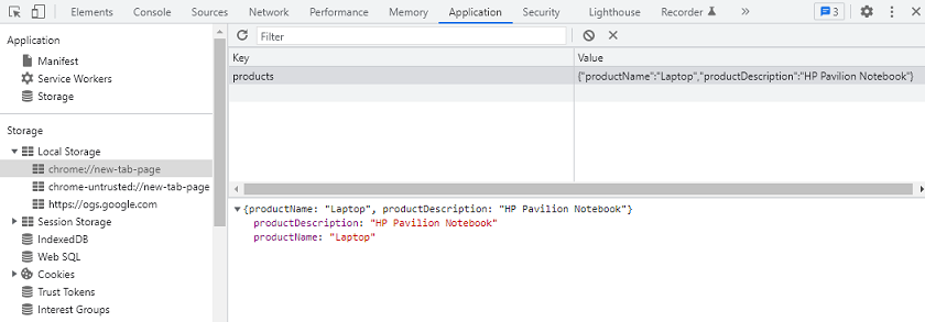 If you want to check the data inside the local storage then go to the local storage inside the application window you can see data as shown in the below image