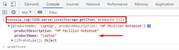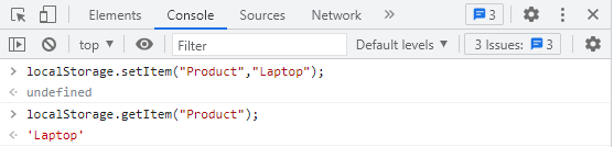As you can see in the above image first we use the setItem() method of local storage which is to set the Product as a key and the Laptop as a value inside the local storage and later on, we take the value of the Product using getItem() of local storage which take the key as a parameter and return the value which is present against the key.