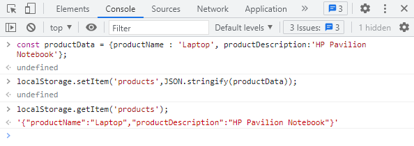 As you see in the above image first we declare one const object and store some product data inside that with the help of key-value pair, later on, we use the setItem() method which is of local storage and use to set the data inside the local storage and you can see we pass two-parameter to that first is a key name and the second one is the object as productData and then we convert that into the JSON Format using JSON.Stringify() method. Next, using the getItem() method are able to see the data present inside the local storage.