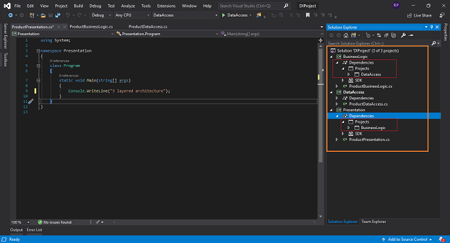 Add Console application Project named Presentation (This is our entry point into the project). Then add one more DLL named DataAccess. (For now, we’re not going to create database, as our main focus in this blog is to understand DI). We will create an Entity class with default values as data. Add one more DLL named BusinessLogic. As per the 3 layered architectural pattern, UI communicates with BusinessLogic and BusinessLogic gets data from DataAccess layer. To achieve this, first add BusinessLogic’s reference in Presentation module, then add DataAccess’ reference in BusinessLogic.