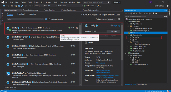 Rename the program class ProductPresentation and add the following code. Create a UnityContainer object coming from namespace using Unity. Use RegisterType method as follows, you can see it takes “Generics”. First is the interface and second is your Class. By doing this UnityContainer would know where to look for dependencies. Use Resolve method which takes generics as parameter. And we’re solving dependency rather than creating an object.