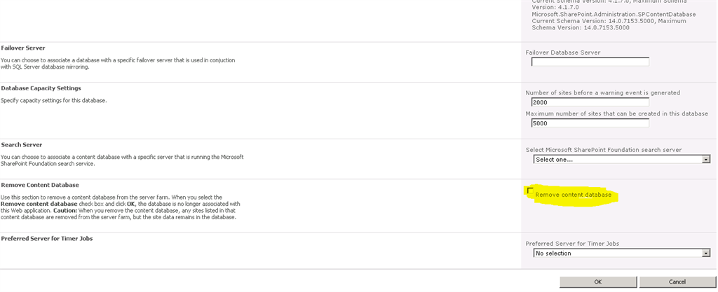 To detach the content database, open the content database, check Remove Content Database, and click OK.