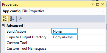 Next, right click on App.config and select properties. Change below two properties values,