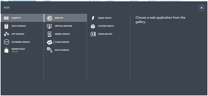 New -> Compute -> Web App -> From Gallery (Ready templates are available by  category).