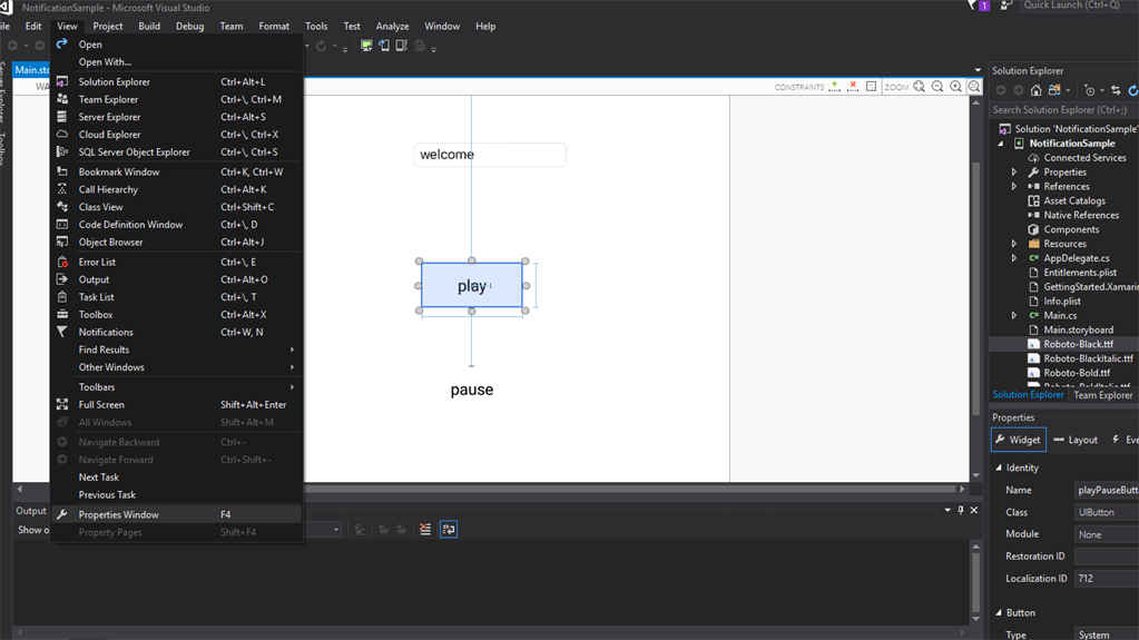 Then select any textfeild or button that you need to change font. Open properties by choosing View => Properties