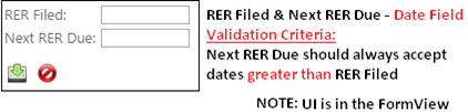 In the below Form View, I have two textbox that accepts dates i.e. RER Filed & Next RER Due dates. I want to add a validation criteria to the Next RER Due field that its values should always be greater than RER Filed Field.