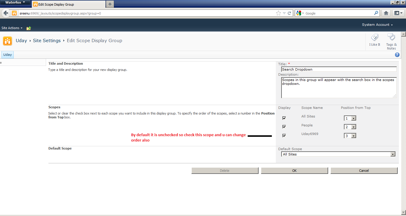 15. Check your scope (which was created in central admin). then Click on "OK".