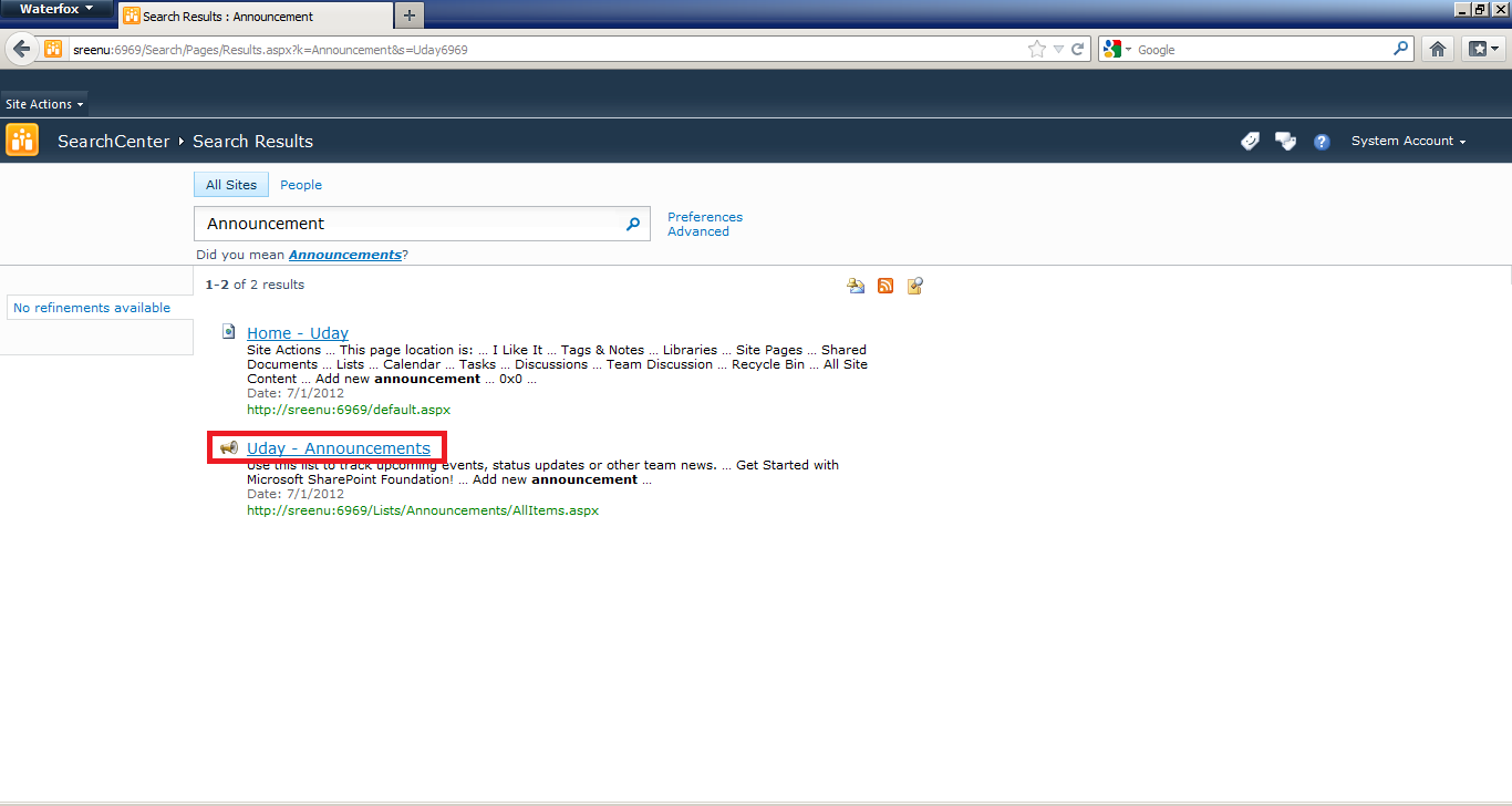 Now copy the search center site url(which looks like 'http://<servername>:6969/Search/Pages/default.aspx'