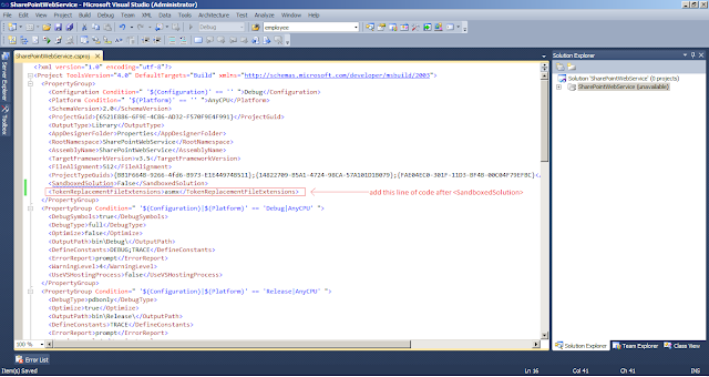 Now add <TokenReplacementFileExtensions> tag after <sandboxsolution> tag