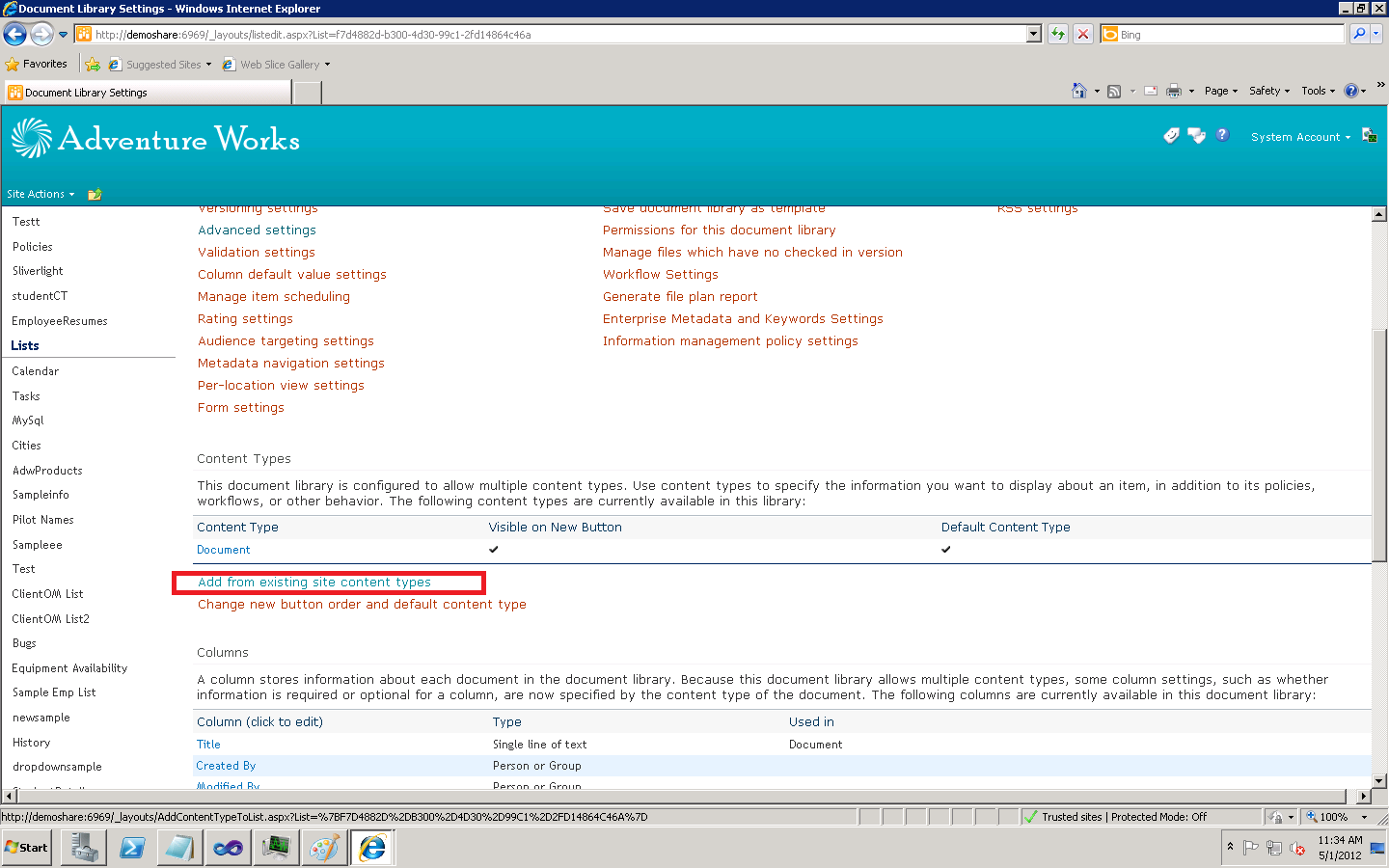 Other Available Field Types <Field ID="{6C70171C-F142-40C7-A6C7-9628B5581180}" Name="EmpID" DisplayName="Employee ID" Required="TRUE" Sealed="TRUE" Type="Text"/> here ID is new guid( To file menu Tools--> Creat GUID , in Create GUID window Click on New GUID next on Copy next on Exit. now paste that guid in ID attribute) Type is what Type of column it is. here it is text means single line of text. 7. After creating fields we need to add these fields reference in ContentType1's Elements.xml file. example , how to add reference for the above field Copy ID , Name and DispalyName attributes and place in <FieldRef/> like <FieldRef ID="{6C70171C-F142-40C7-A6C7-9628B5581180}" Name="EmpID" DisplayName="Employee ID"/> 8.Now Click on Feature1 and Give some proper name and description. Save all File and Deploy the solution(Build--> DeploySolution). 9. Now to your application where u deployed the solution and feature is activated i.e here it is http://demoshare:6969/ and create new Document library (because parent content type i s document) and name it is as "EmployeeResumes". 10. if we want to use newly created content type we need to change default content type. For this follow these types. a.Go to Document library settings click on Advanced Settings b. Select 'Yes' for Allow management of content types (by default it is 'no') and click on 'OK'.