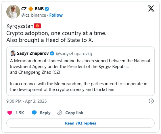 This announcement followed a post by Kyrgyzstan's President Sadyr Zhaparov, revealing that the Kyrgyzstan National Investment Agency (NIA) had signed an agreement with CZ to provide technical expertise and consulting services to the Central Asian nation.