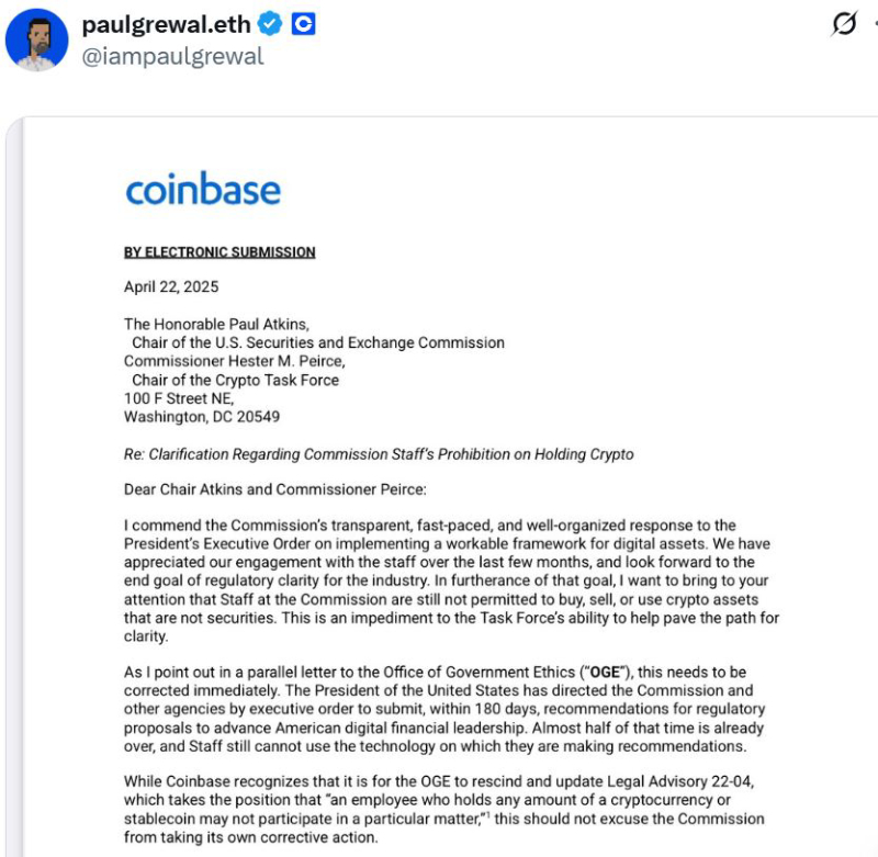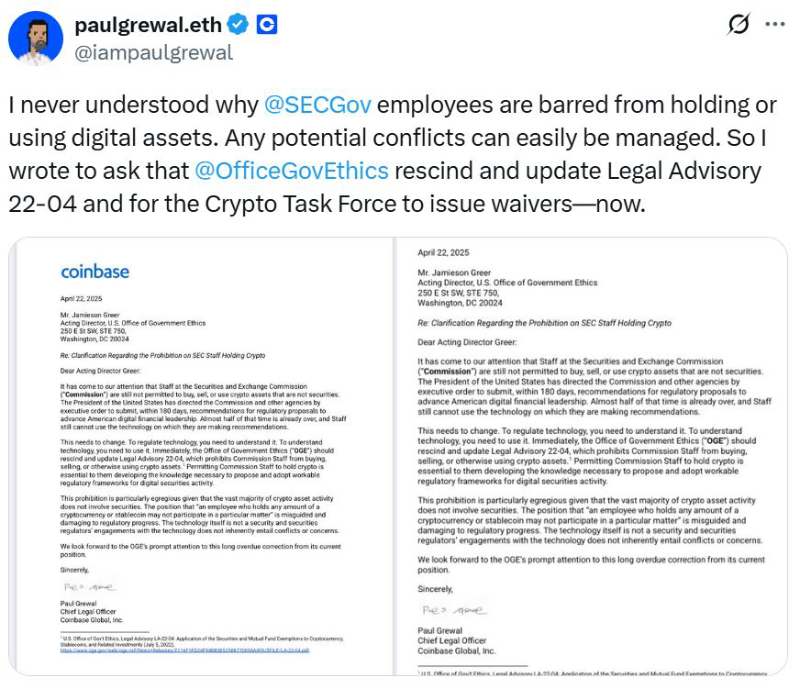 While the decision to lift the advisory ultimately lies with the OGE, Grewal believes the SEC itself should take action. Specifically, he suggested that the SEC issue waivers to members of its Crypto Task Force and others working on crypto-related matters, aligning with precedents where waivers were granted in similar advisory contexts.