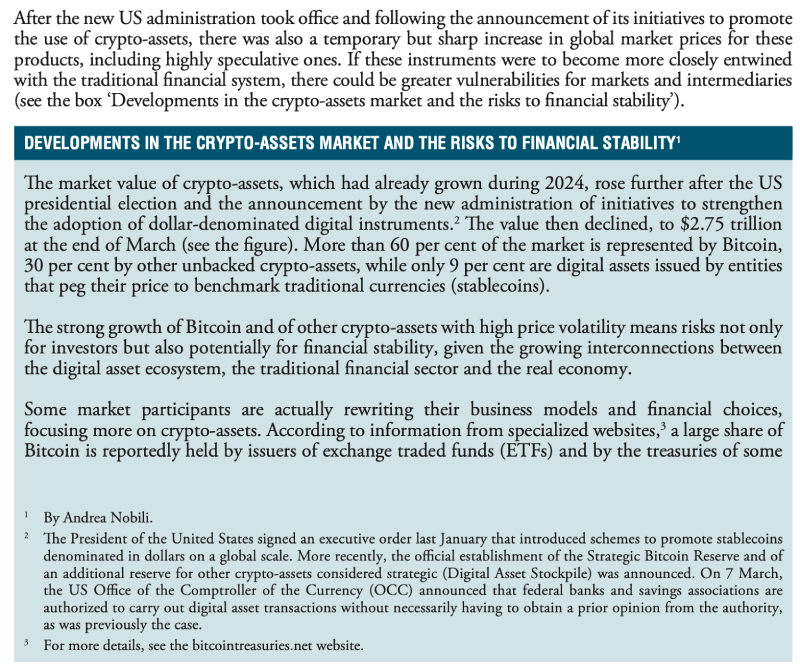 The Bank of Italy has raised significant concerns over the growing integration of cryptocurrencies into the traditional financial system, highlighting potential risks to both investors and overall financial stability. In its April 2025 Financial Stability Report, the central bank emphasized that the rapid expansion of Bitcoin and other volatile digital assets could pose systemic threats due to their increasing interconnections with conventional finance and the real economy.