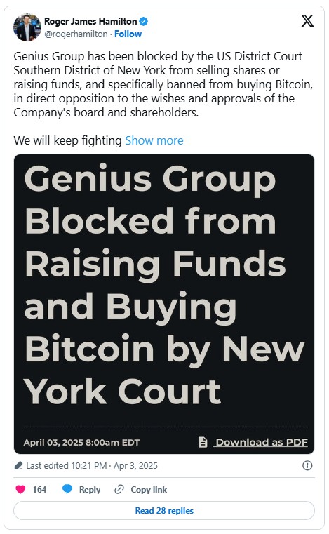 The New York District Court issued a preliminary injunction (PI) and temporary restraining order (TRO) on March 13, related to a broader conflict involving its merger with Fatbrain AI, according to an April 3 statement from Genius Group.