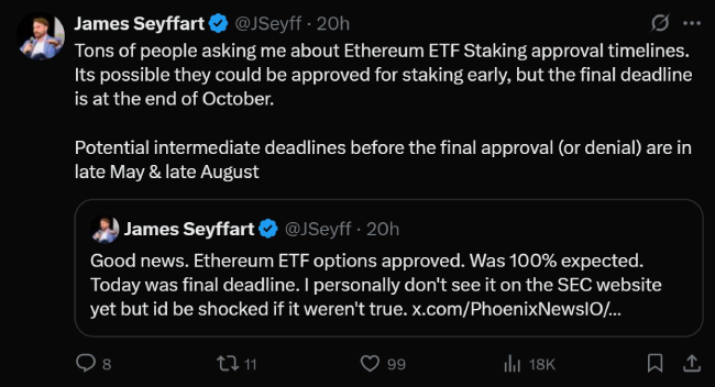 James Seyffart, a Bloomberg analyst, said that staking might be authorized in the US as early as May.
