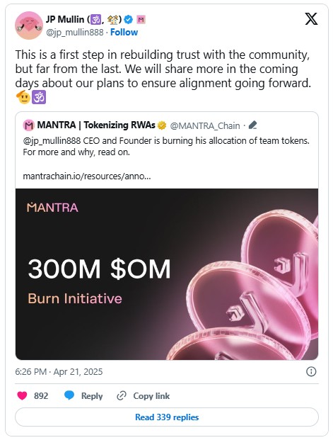 On April 21, Mantra announced off the unstaking process, and it’s on track to finish by April 29. At that point, all of Mullin’s MANTRA OM tokens (currently trading around $0.85 each) will be sent straight to the burn address—meaning they’ll be permanently removed from circulation.