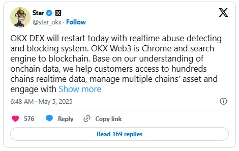 In a May 4 post on X, OKX founder and CEO Star Xu confirmed the return of the DEX aggregator and introduced a key new feature: a real-time system that detects and blocks abusive activity as it happens. Xu described OKX Web3 as a kind of "browser and search engine for blockchain," offering users a more intuitive way to access decentralized finance (DeFi) markets.