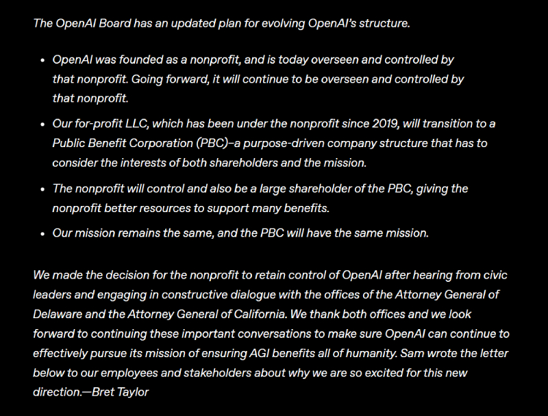 While backing off from a complete for-profit model, OpenAI remains focused on securing additional funding to drive AI advancements. The PBC structure enables employees and investors to hold equity while ensuring the nonprofit board retains control over key decisions, guiding profits toward societal benefits. The board's chair, Bret Taylor, reaffirmed that this balanced approach supports OpenAI's commitment to safe and inclusive AI while meeting global demand for AI solutions, without compromising its values.