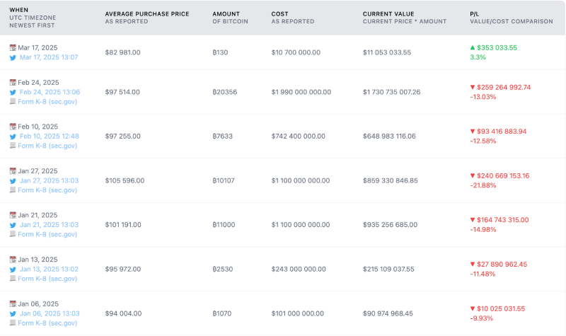 As per data from SaylorTracker, Strategy’s most recent Bitcoin purchase took place on March 17, when the company added 130 BTC—valued at $10.7 million—to its reserves. This brought Strategy’s total Bitcoin holdings to 499,226 BTC. Notably, the March 17 acquisition was one of its smallest purchases on record and followed a two-week pause in buying.