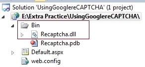 - After adding the Recaptcha.dll reference into the web application the bin folder will look such as follows.