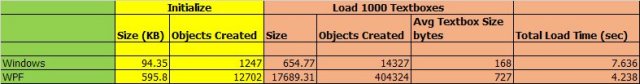 The above summary shows that WPF controls have much higher memory footprint than its counterpart Windows controls since WPF controls are designed in a different way and needs more smaller units initialized to create a control. But one thing to observe that WPF total load time is better than Win forms application. I am going to cover this in the next post as in why this occurred.
