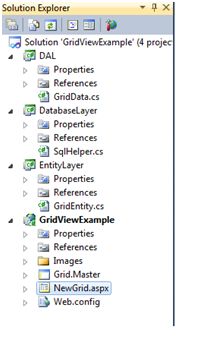 - Next create the solution from Visual Studio. First create a solution add three class libraries named "DAL", "Databaselayer", "EntityLayer" and one web application named "GridViewExample" as ini the following image.