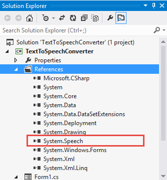 Go to Form1.cs (code behind .cs file) and add System.Speech (the System.Speech namespace contains types that support speech recognition) and System.Speech.Synthesis namespace (the System.Speech.Synthesis namespace contains classes for initializing and configuring a speech synthesis engine and for generating speech and so on).