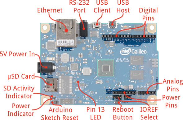 In addition to supporting the Arduino shield ecosystem, the Intel development board comes with many computing industry standard I/O interfaces, including ACPI Express, PCI Express, 10/100 Mbit Ethernet, Micro SD or SDHD, USB 2.0 device and EHCI/OHCI USB host ports, high-speed UART, RS-232 serial port, programmable 8 MB NOR flash and a JTAG port for easy debugging.
