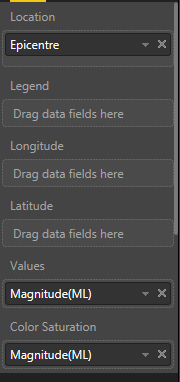 The Values field is used to show some details when hovered on the data point while the Color Saturation is used to show the variance in the value by the differences in color. You can see the slight change in the shade of blue at the data point. The higher the value the darker the color. You can also change the color if you like.