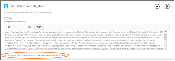 In Windows Phone App Studio we have various types of Data Sources. Some of the Data Sources are for dynamic purposes and some are for static use. A HTML Data Source is in that category. It is a Data Source that holds the HTML content. It supports only basic HTML tags like div, image, table, anchor and so on. The Style is tag is not supported. This HTML Data Source comes with one detail page that is used for displaying the HTML data. This Data Source suffers from one shortcoming, the finite length of HTML. You can enter the HTML content up to the length of 2048 characters. Since this tool is in beta stage, we can expect to have a remedy to this problem in the future releases from Microsoft. This issue is also raised in the user voice forum of Microsoft.