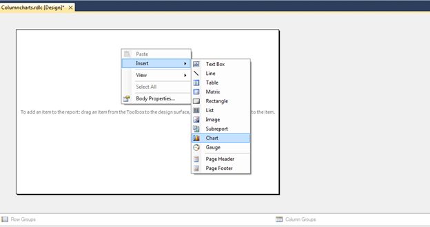Now right-click inside RDLC Colunm Report for adding a chart as shown below.