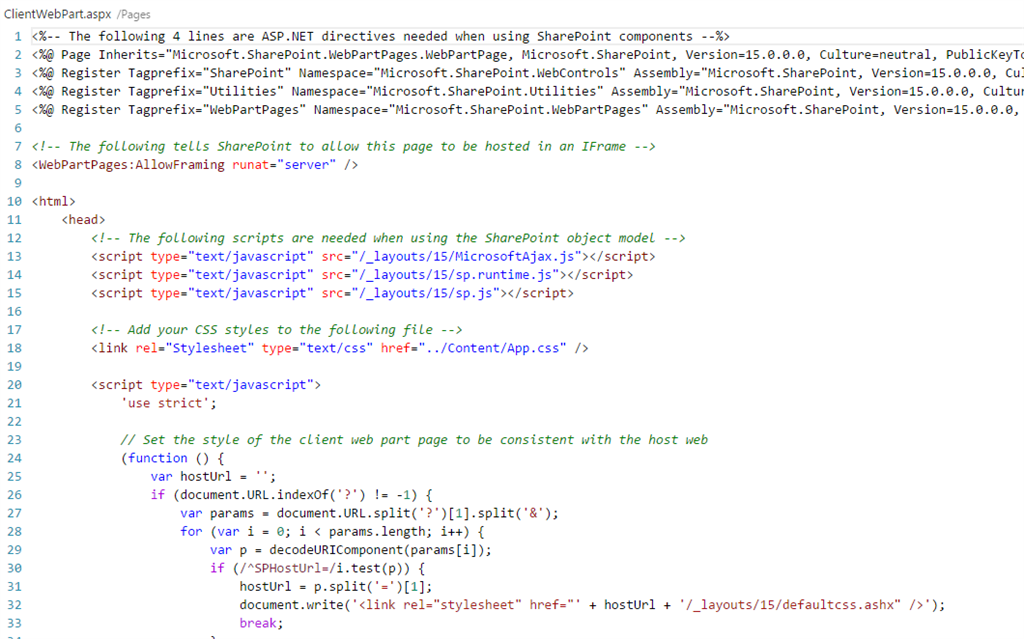 - We will add a button and a function to initiate the event. Click on the “ClientWebPart.aspx” on the left side.