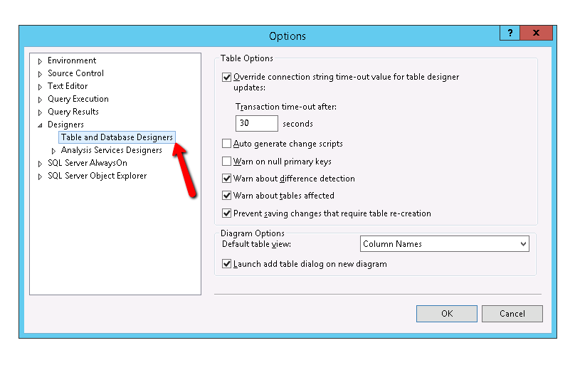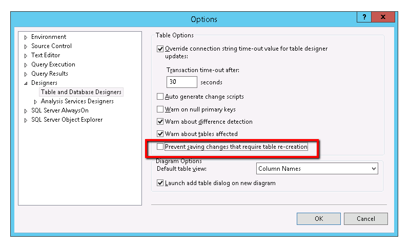 It is time to change the settings. As you can see there is a check box captioned as “Prevent saving changes that requires table re-creation” . Just uncheck that and click OK.