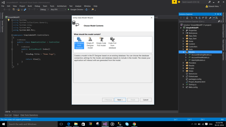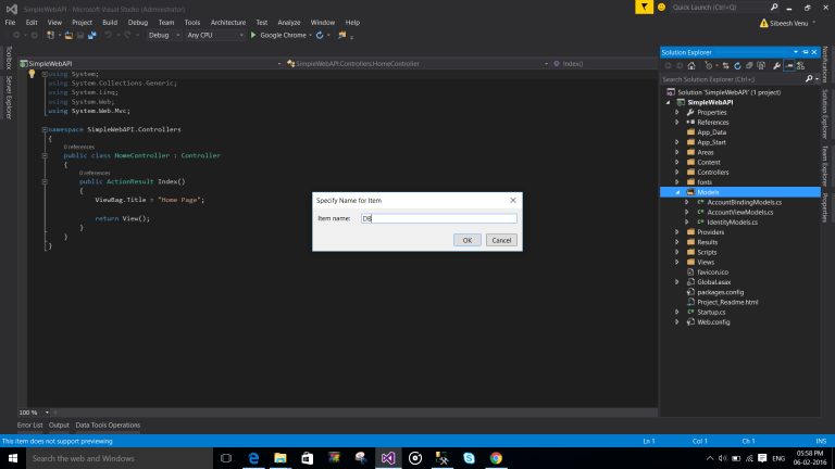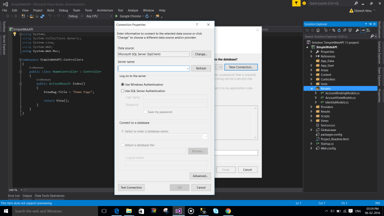 We will create our project in Visual Studio 2015. To create a project click File, New, then Project. And select Web API as template.