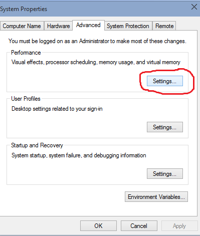 When you go to the Advanced system settings you will see a new window. In this window click on the Advanced tab and select the performance settings as in the following picture.