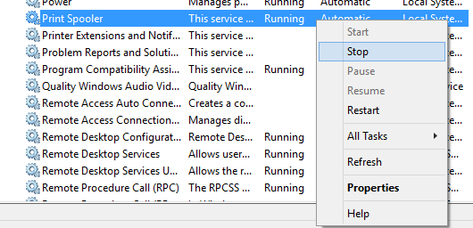 Now in the available services choose the service you want to stop. Here you can disable a service permanently. So for stopping a service just right-click on it. For example, here I want to stop the service Print Spooler. So just right-click on it. Here you will see the option Stop. Click on it. Now the service is in stop mode.