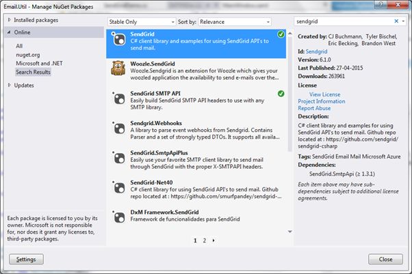 For SendGrid, the first thing we need to do is add a Nugget package named SendGrid as in Figure 10. I already installed it in my project.