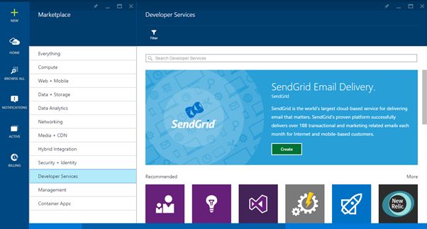 Select Marketplace. In Marketplace select developer services there in the right blade you will find SendGrid.