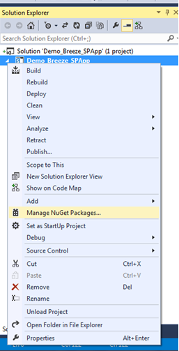 Step 2 : Right-click on the project and select "Manage Nuget Packages".