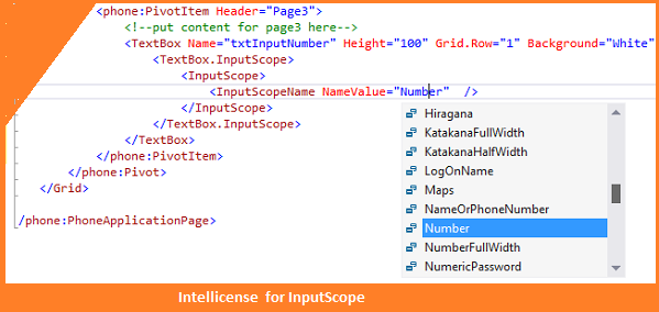 We can follow the syntax like above code snippet if we like to see the IntelliSense for InputScope values. Let's see the following screenshots which shows the IntelliSense windows with various values like numbers and others.