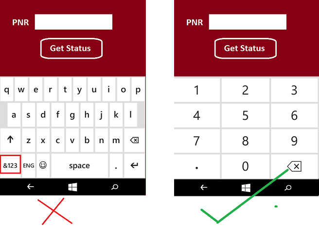 PNR status (for train birth status ). When user tap on textbox and if it shows a keyboard of type text, then it is not best for users. Let us see the example screenshot,