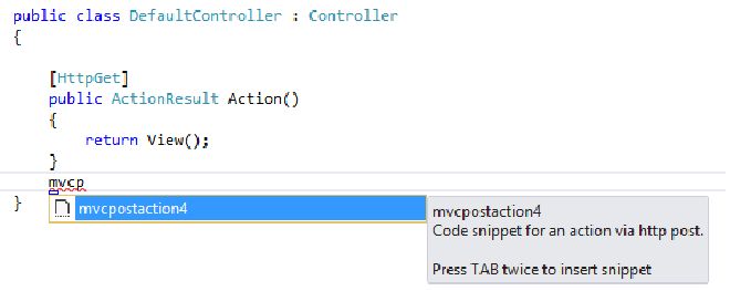 - For creating MVC [HttpPost] action method, use mvcp and press TAB twice.