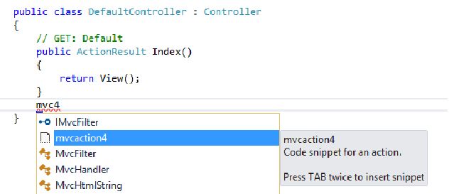 - For creating an MVC [HttpGet] action method use mvc4 and press TAB twice.