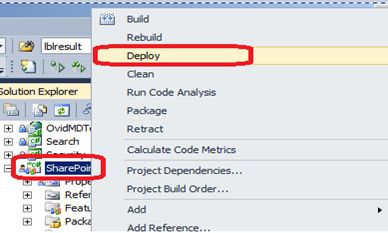 To deploy the SharePoint project, In the Solution Explorer right-click on the SharePoint UI project and select Deploy as as in the following.